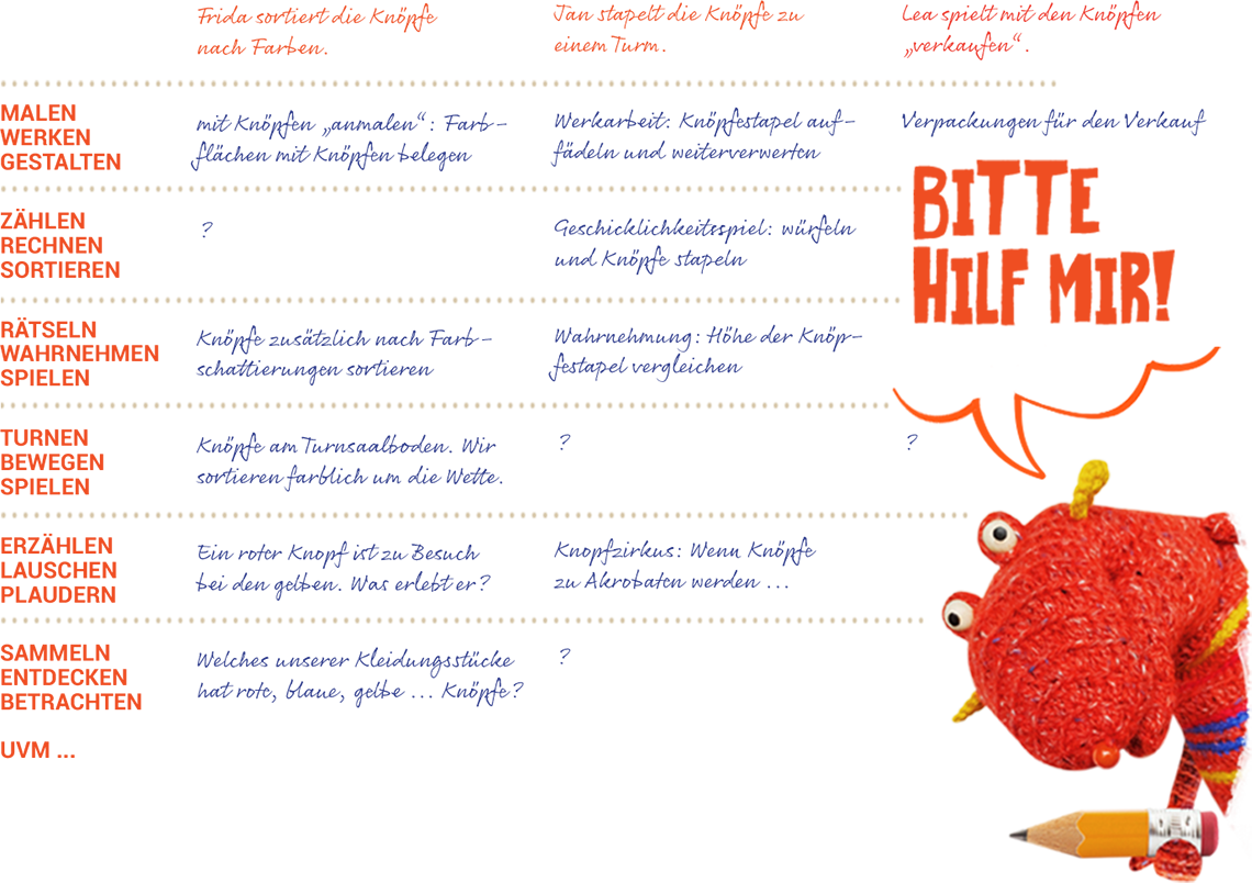 Erst im zweiten Schritt wähle ich für jede Beobachtung einen oder mehrere brauchbare Gedanken und Spielimpuls(e) aus. Bei meiner Auswahl achte ich darauf, die individuellen Lernbedürfnisse aller beobachteten Kinder zu berücksichtigen. Im dritten Schritt plane ich die Auswahl an Spielangeboten – je nach Vorbereitungsaufwand oder Komplexität der Umsetzung – in die Projektplanung der nächsten Arbeitstage mit ein. Ich lade dich dazu ein, dich mit dieser Technik vertraut zu machen. Du wirst erstaunt sein, wie viel Kreatives daraus entstehen.
